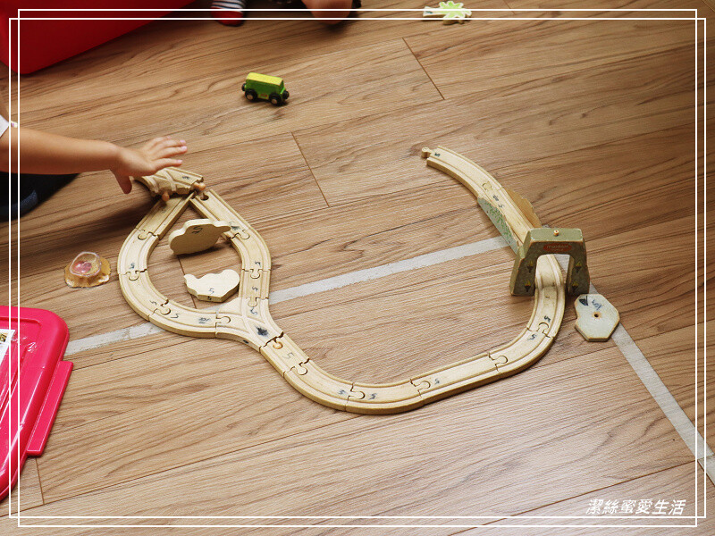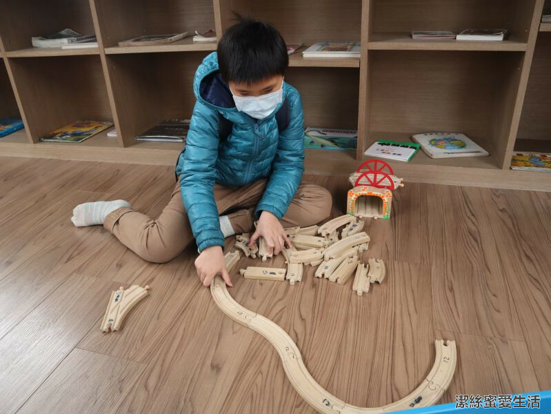 空間寬敞且木質地板很舒適,可以免借租借積木軌道遊戲(一次只能借一組)。