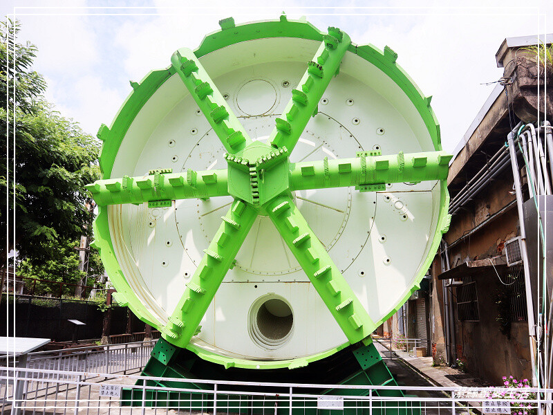 沿著入口鐵軌進來,就會馬上被這台大機器吸引去!這是國內第一具開放實體的潛盾機,曾經完成過北捷新莊線部分潛盾隧道段,它是以轉動前方切刃盤方式鑽掘土石,實際就近看超狀觀的。