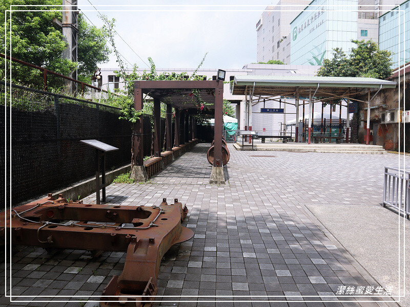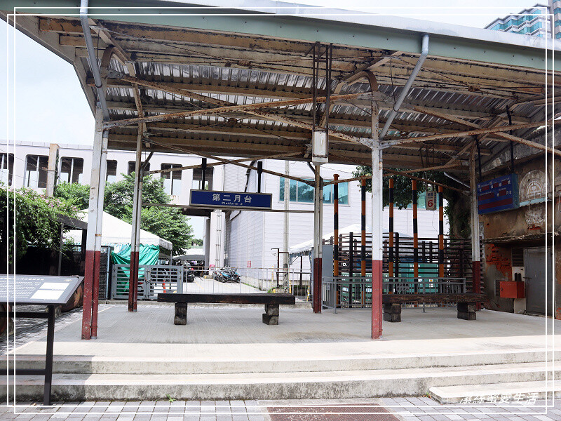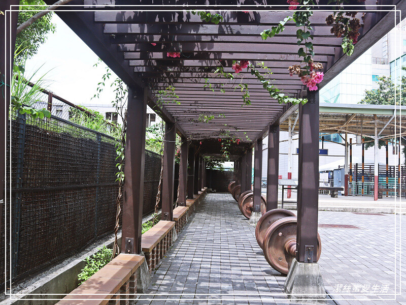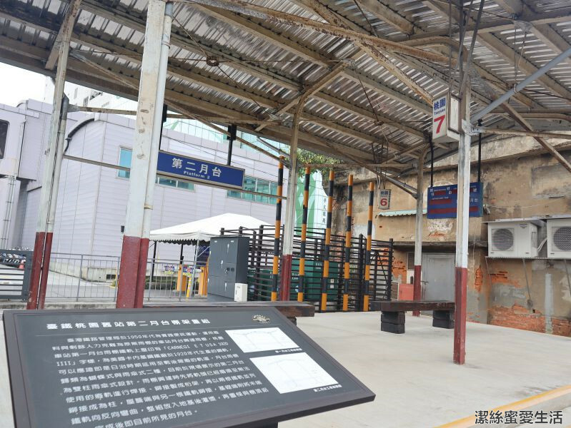 再往前走去是桃園舊站第二月台的重現,早年設備較刻難,是沒有頂篷的,柱子也是用鐵軌製成;看著這小復古樣貌,就回想起當年高中時期都是常坐火車通勤的,雖然是在台南不是桃園。