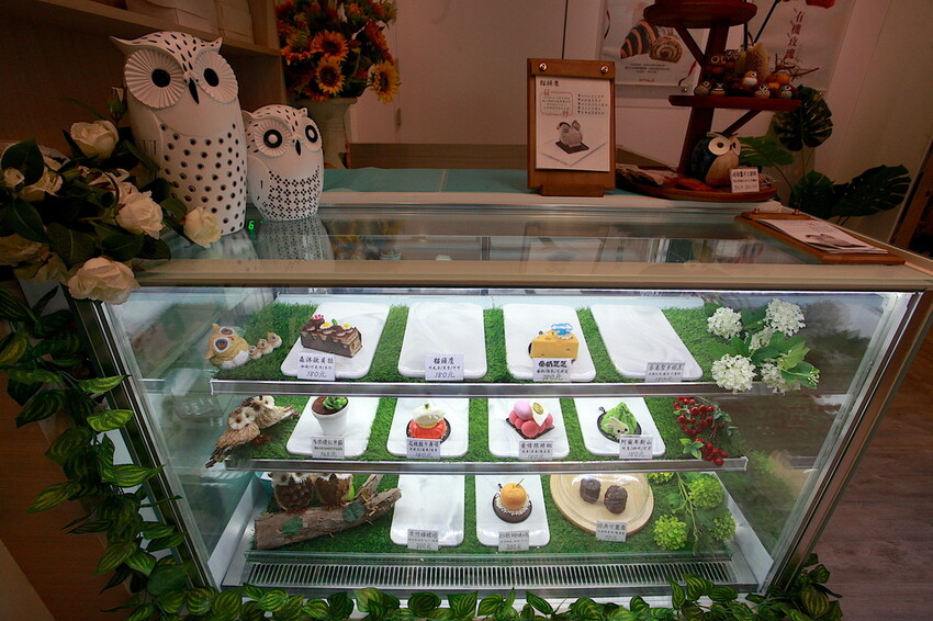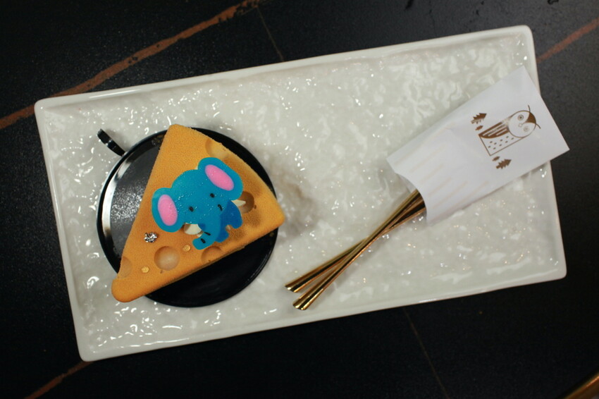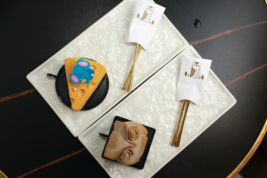 店家吉祥物貓頭鷹製作創意甜點,採用66%可克力慕斯、新鮮蜜漬黑李、法式純巧克力蛋糕、法式可可塔皮及食用級裝飾金粉等。