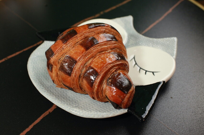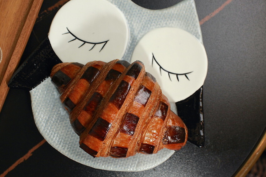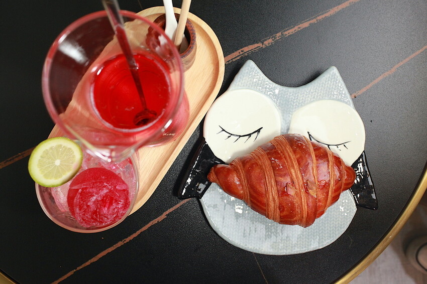 這貓頭鷹瓷盤上是巧克力可頌90元。