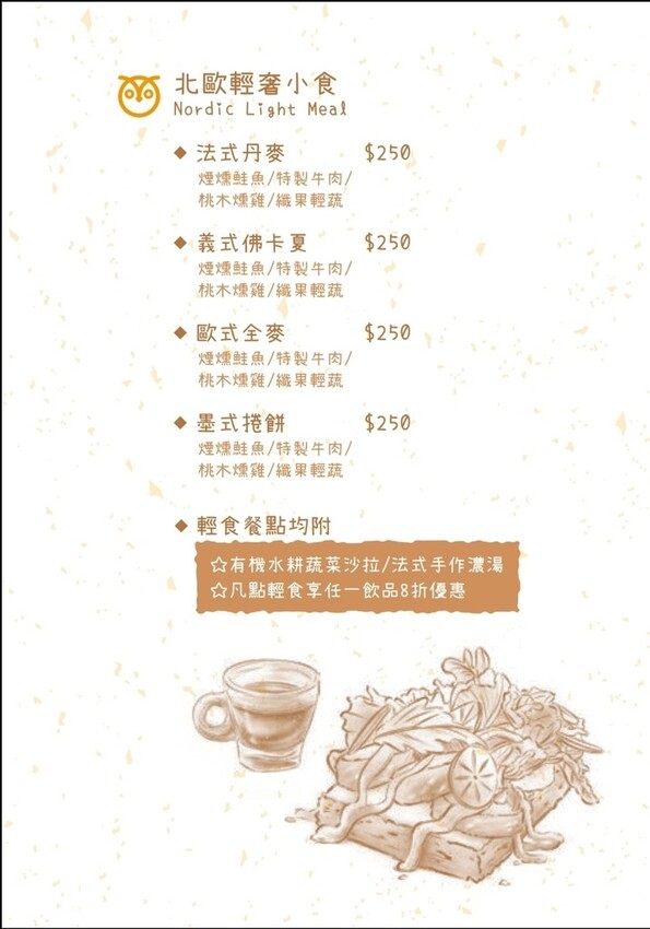 這是菜單從店家官網下載與各位參考,菜單主要有菜單有咖啡類、花茶類、經典茶飲類、法式緞帶可頌類、北歐輕食類及特調飲品類等,整體餐點品項多定價合理範圍內,點輕食類享任何飲品8折優惠。