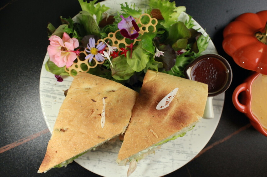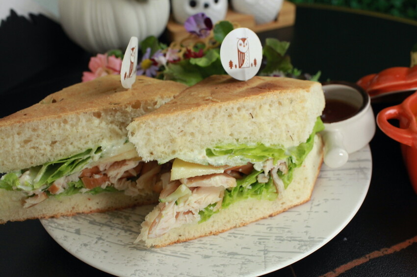 這義大利麵包佛卡夏帶點橄欖油鹹香滋味,裡面夾著特製牛肉、桃木燻雞、煙燻鮭魚及生菜等,這佛卡夏紮實鹹香滋味新鮮超好吃