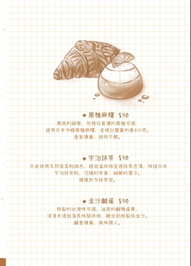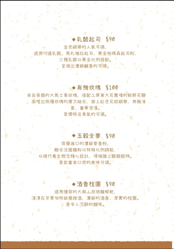 桌面上有有機玫瑰可頌100元、濃巧克力可頌90元、天然莓果可頌90元、夏威夷Kona冰滴咖啡200元、蝶豆華爾滋180元及玫瑰圓舞曲180元等。