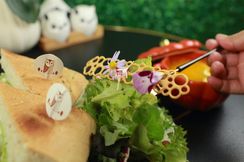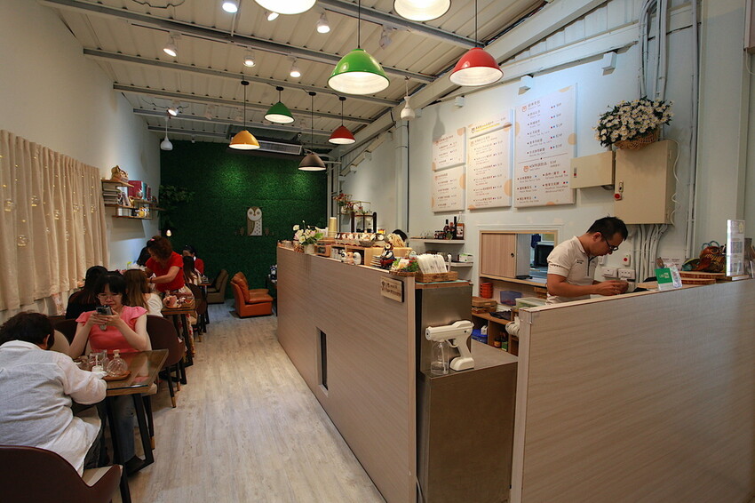 大門推開牆面有樹木貼紙圖案,貼上貓頭鷹玩偶凸顯出餐廳意境。