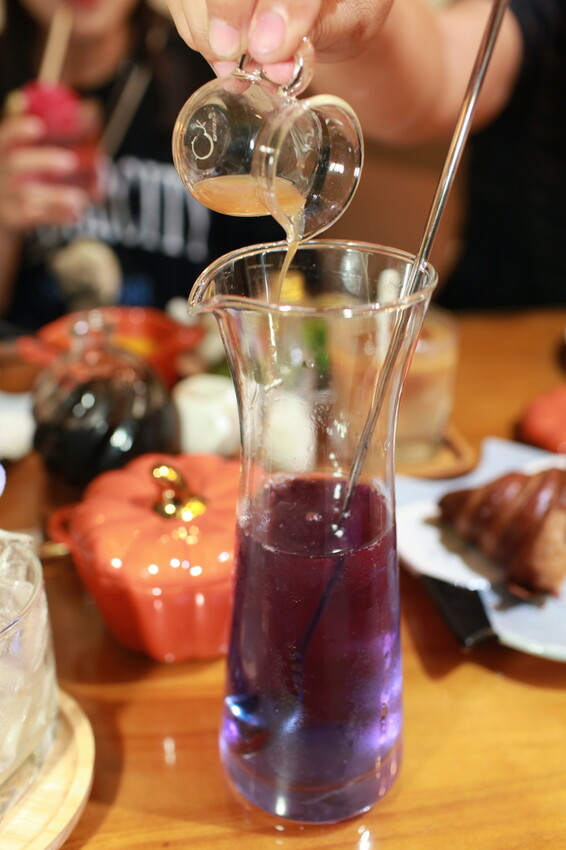 把檸檬汁倒入蝶豆花裡面產生變化。
