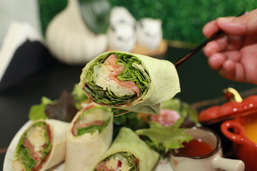 這捲餅很像是台灣的春捲,捲餅裡面包覆著生菜、煙燻鮭魚、蘋果丁及沙拉,捲餅很Q彈清脆鹹香無腥味真好吃