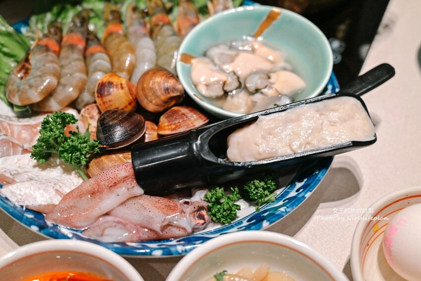 海鮮盤有花枝漿、蛤蜊、魚肉、 鮮蝦、 牡蠣、 花枝等。