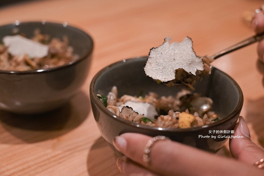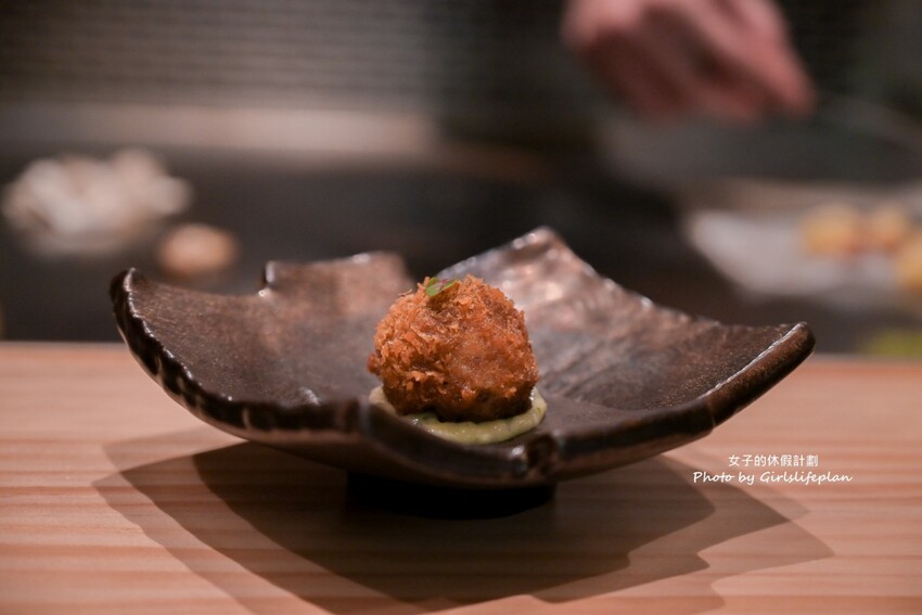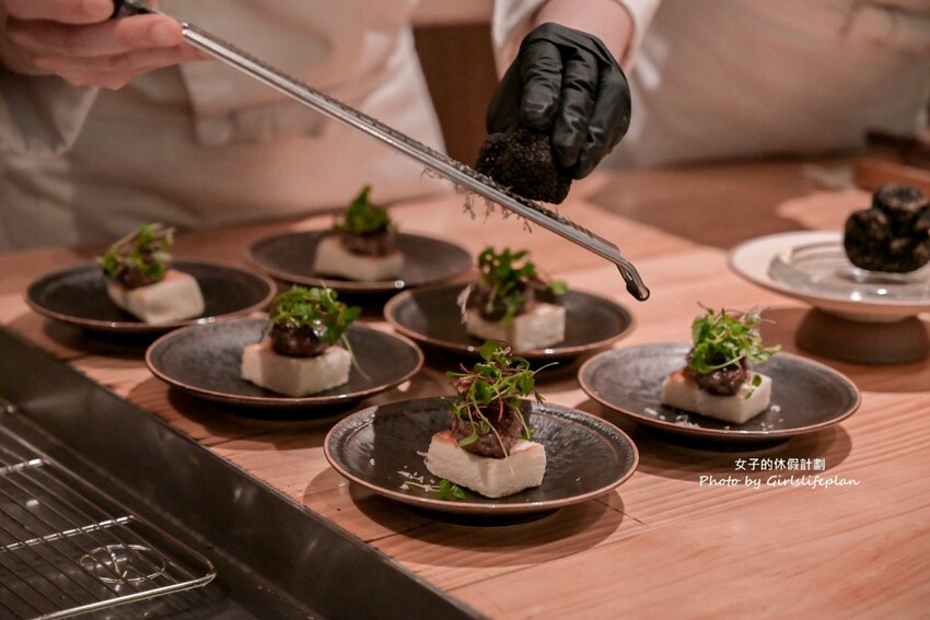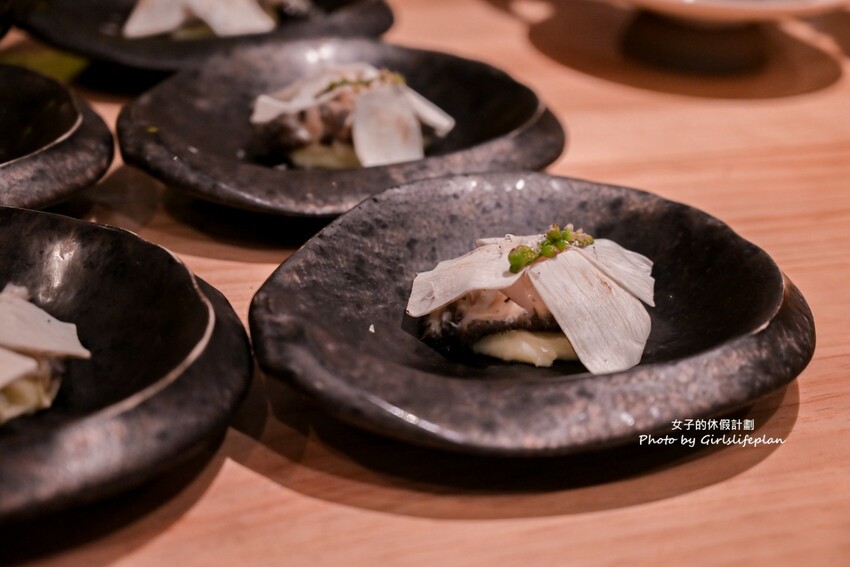 職人將鮑魚切片方便食用,鮑魚鮮甜彈牙,底層舖上馬鈴薯泥再加上炙燒過的筍片、現刨松露,入口的瞬間在未知的阪前料理展現下,體驗到大海賜與的鮮美與陸地上的風韻,有了松露的點綴,使得整體口感更加豐富。