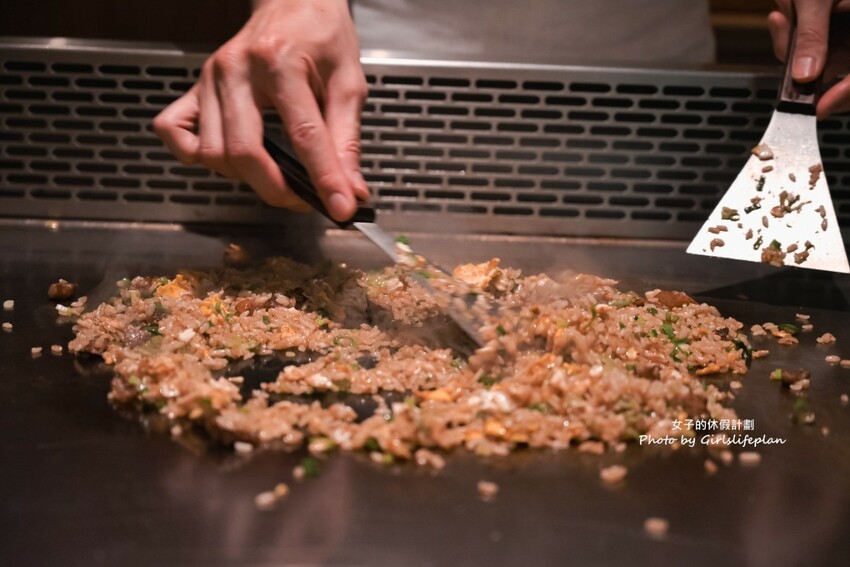 漸漸到了尾聲,真的會有種捨不得的結尾耶。職人在炒飯的時候滋滋作響的聲音,與炒飯蔓延的香氣逼人,整個人就是在與鐵板上鏗鏘之聲與之共舞了,一秒治癒啊。