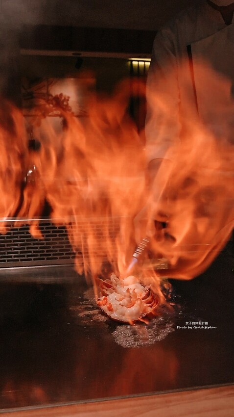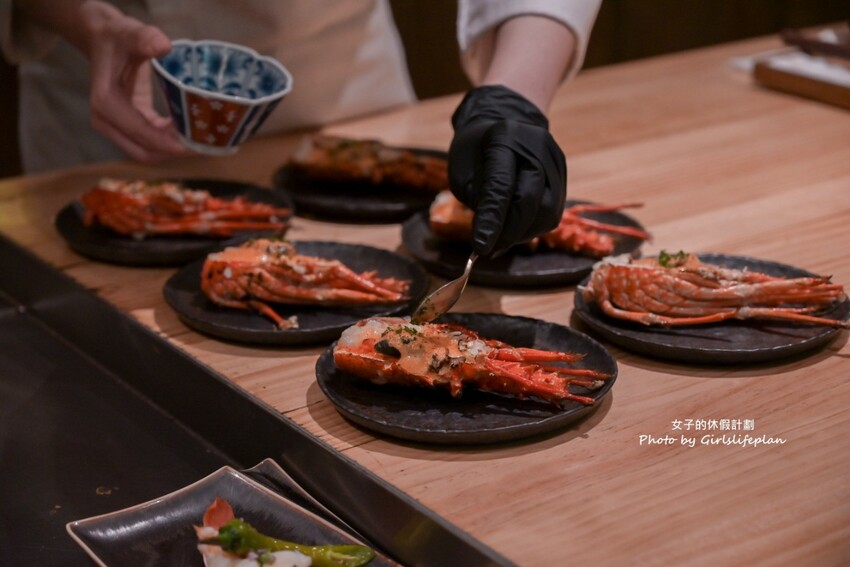 龍蝦有兩吃,蝦身用日本鹿兒島赤猿燒酎炙燒出香氣,火焰秀燃起超級有看頭,精彩!
