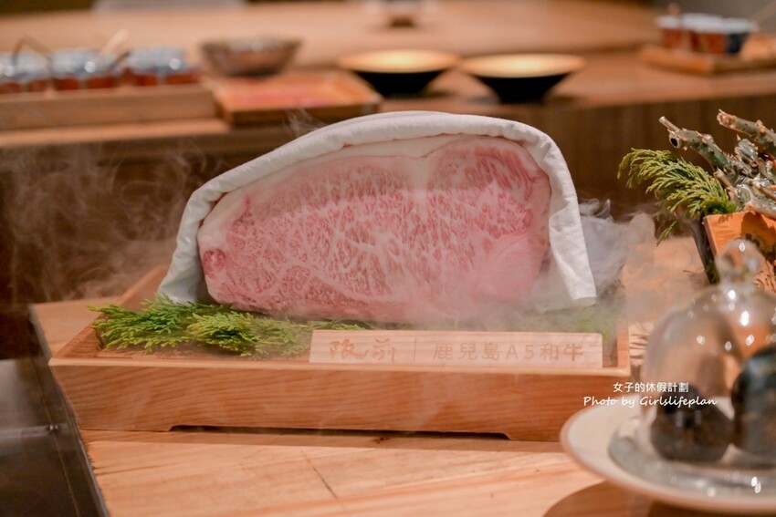 日本A5和牛在鐵板煎到雙面上色後,靜置低溫熟成,加上XO白蘭地炙燒更添香氣,又是一場震憾的火焰秀。