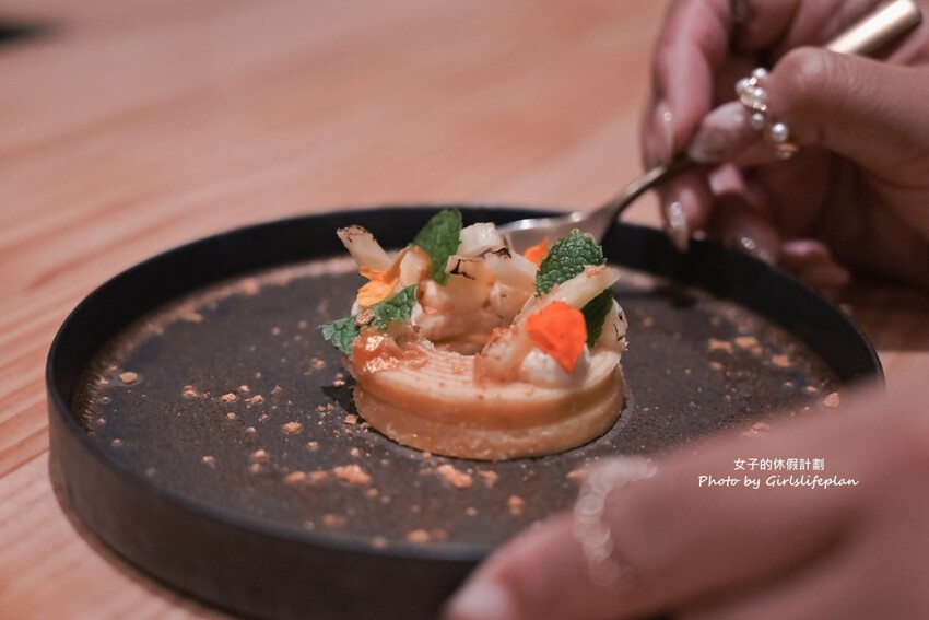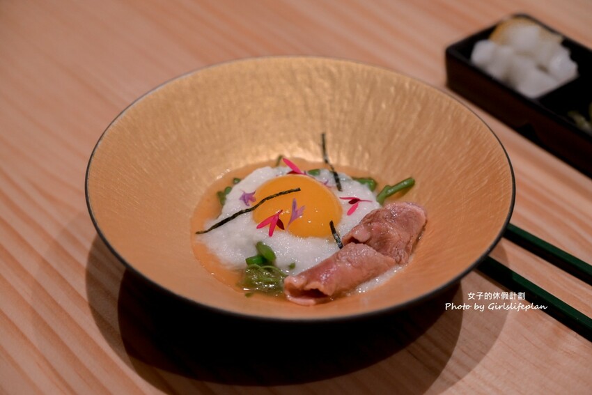 這一道居然是分子料理,看起來是水波蛋但其實蛋黃是芒果晶凍,再將炙燒五分熟澳洲M9和牛薄片鋪在山藥泥上,整體相當清爽也很賞心悅目當開場很不錯。