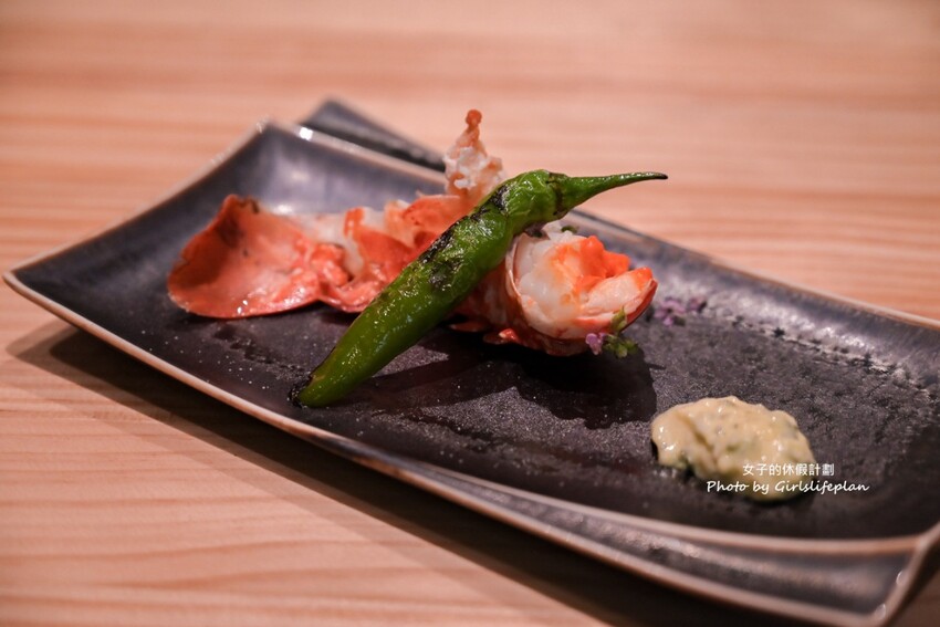 龍蝦頭以日本傳統甲羅燒為靈感創作,以龍蝦頭當容器加入之前留下來的鮑魚肝及明太子炙燒,整體滋味濃郁鮮美令人回味再三阿,這道是最令我驚豔的美味。