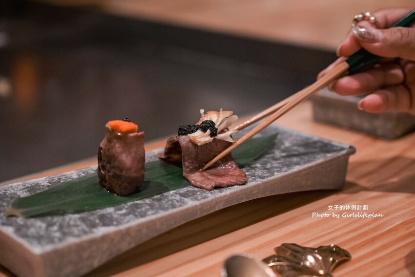 將M9和牛做成海膽軍艦卷,以及松露和牛握壽司,堆疊不同的層次感讓M9和牛更好吃了。海膽化在嘴裡的甜味與和牛滿溢的肉汁,真的幸福到拍手叫好,松露就更不用說,其獨特香氣賦予和牛更奢華及高貴的味蕾饗宴。