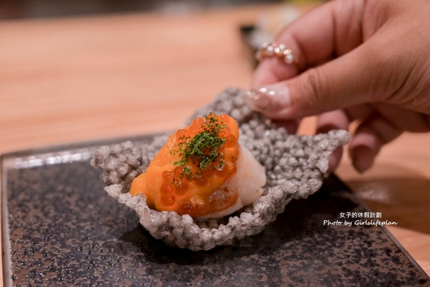 嚴選北海道生食級干貝,上面鋪了海膽南瓜泥和鱒魚卵,放在嘴中超級鮮甜飽滿,這道干貝超級無敵大顆,無法一口塞入的滿足感有夠鮮甜美味,是第一口就會蹦出日文「幸せ」滿滿捧著臉的幸福感,有夠好吃。