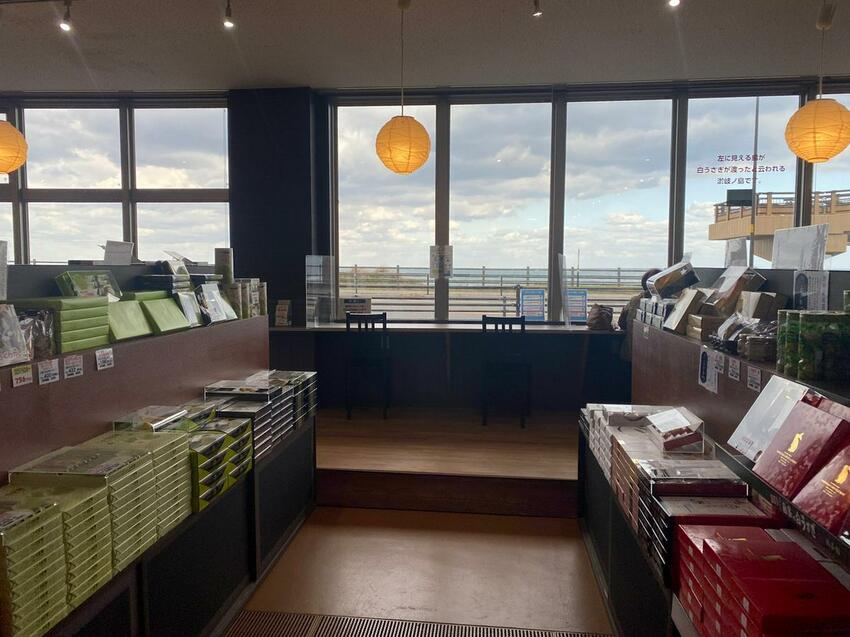 白兔神社 下方 白兔海岸 對面道路休息站,販賣當地酒與特產,店內即可以遙望海邊。也有不少柯南周邊喔。二樓餐廳還可嘗到特色黑心造型辣韮漢堡&猛者蝦漢堡。附近白兔相關美食跟商品,記得探索!道路休息站: 原創硬幣、白肌御守、白兔燒、白兔蛋糕 等等等。白兔神社: 人氣白兔造型御守、愛心造型繪馬、愛情誓言書、結緣石、白兔擺飾神籤