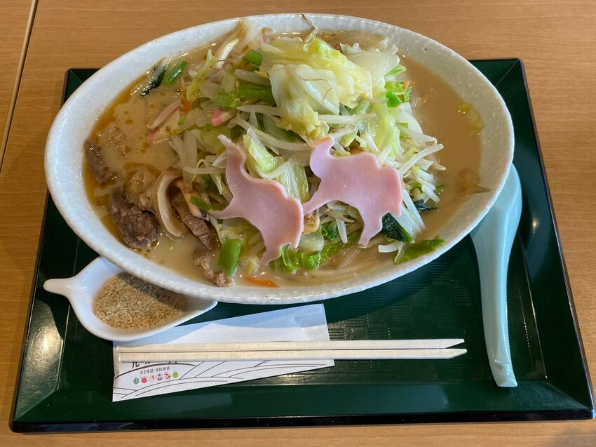 位在 鳥取砂丘 纜車搭乘處的店家~除了有豐富伴手禮,還可以用餐喔!牛骨強棒麵(砂丘旨乗せ牛骨ちゃんぽん)1000日幣:滿滿蔬菜盛裝,麵條吸滿湯汁,幾乎是兩人份的量!砂丘海鮮丼 1800日幣 :滿滿14種海鮮,当店人気No.1