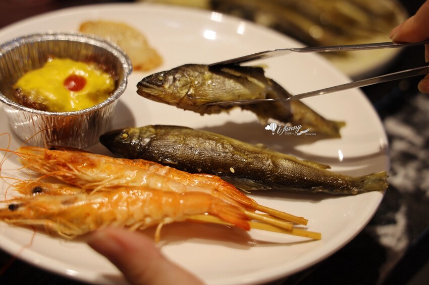 其他有培根捲杏鮑菇、烤蝦、酥炸鮭魚骨、雞捲、香魚及壽司。