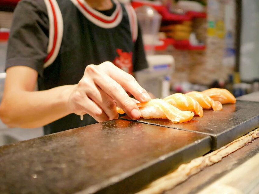 握壽司有鮭魚.旗魚,黑鮪中腹.星鰻,紅甘.干貝.紅蝦.鮭魚肚,比目魚,鮭魚卵.花枝.炙燒和牛.吃貨們可以盡情享用生魚片. 那鮮甜的油脂潤澤感讓人陶醉其中~