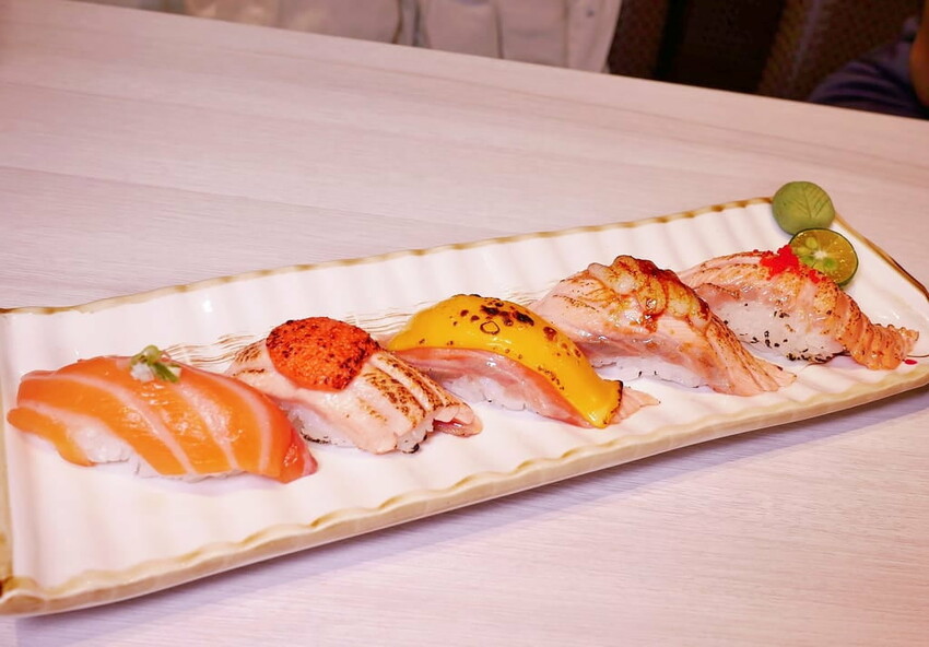有鮭魚/炙燒鮭魚肚/炙燒起司鮭魚/明太子鮭魚/焦糖鮭魚.五種吃法呈現出不同特色和最佳口感.油脂豐富的鮭魚肚.經過炙燒後.有著入口即化好滋味.讓人一吃就上癮. 太銷魂了!