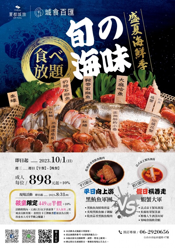 台南夏都城旅城食百匯自助餐今年(2023)夏天推出「旬の海味 盛夏海鮮季」喜歡吃海鮮的朋友們千萬別錯過,這次期間時間從即日起到2023/10/1結束,大家可以趁著暑假帶家人朋友一起來享用;盛夏海鮮季更推出了期間限定料理,分別為平日向上游-黑鮪魚軍團、假日則推出假日橫著走-蝦蟹大軍,讓你可以在餐期吃到黑鮪魚、帝王蟹、紅蟳、軟殼蝦、松露松葉蟹蒸蛋,再加上各式各樣的各國料理,搭配上精選的紅白酒、各款啤酒和甜食冰品,真的很適合慶功宴或是聚餐的人們啊!除此之外,從6/1~8/31帶12歲(含)以下的小朋友來用餐,打扮成「美人魚」符合海洋、夏日任一款主題裝扮,拍照打卡上傳至臉書並設為公開,小朋友本人就可以享當日餐費半價+10%的優惠喔。(詳細價格可參考內文)