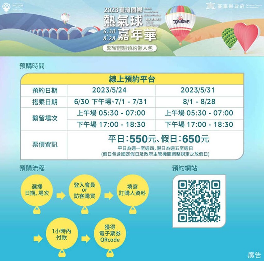 臺東縣政府今(15)日宣布於5月24日與5月31日中午12點,分兩階段開放購票,每場次僅開放80位名額,想乘著熱氣球俯瞰鹿野大地美景球迷,歡迎在「2023臺東慢遊趣」線上預約平台(https://www.eztravel.com.tw/activity/taitungballoon/)準時上線搶訂。