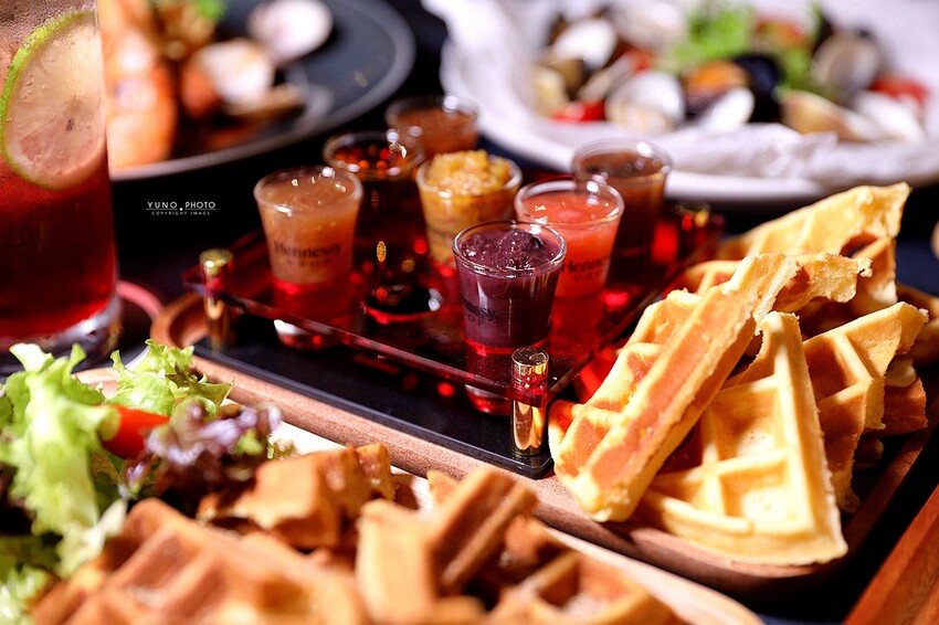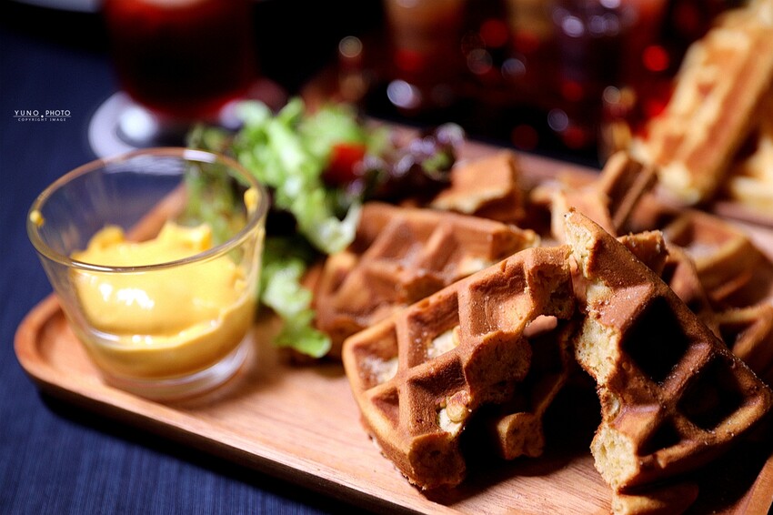 鬆餅內還包入培根 撒上檸檬芥末椒鹽 沾上點起司醬 真的超邪惡的