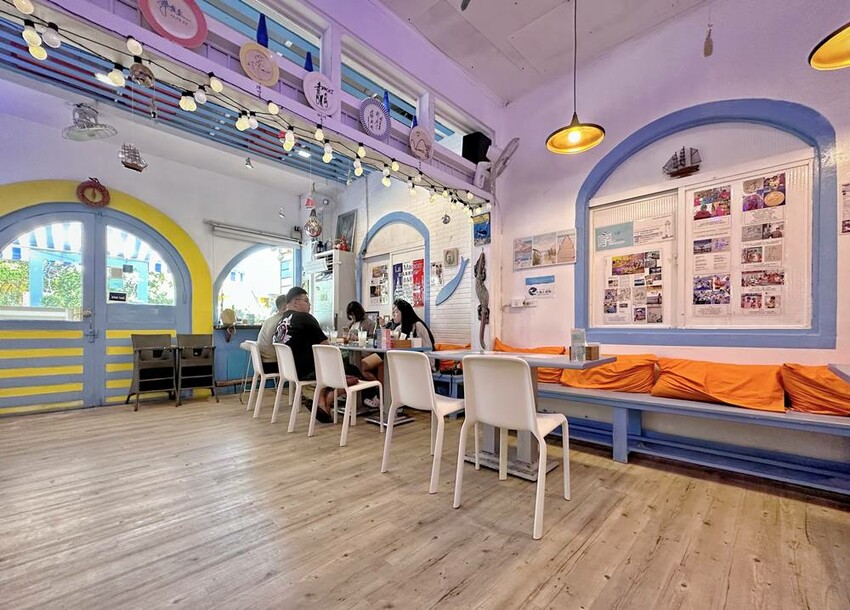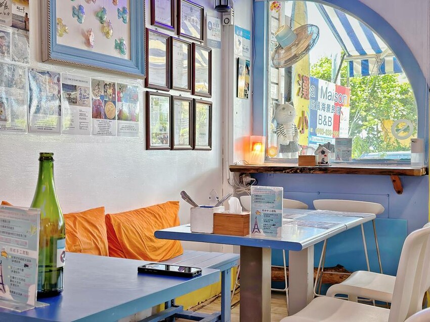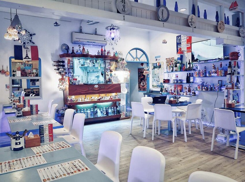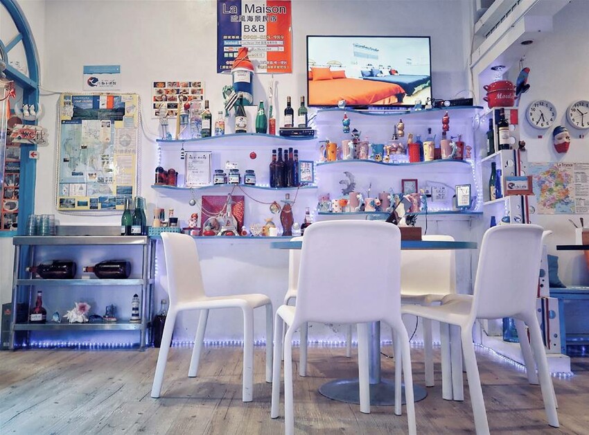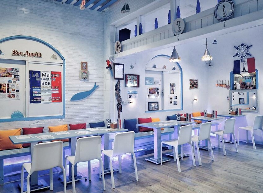 沙灘小酒館的店內裝潢以藍白色為主軸,它代表著天空與海,也代表著墾丁這塊土地的美景風貌,同時也呈現淡淡歐洲風情。