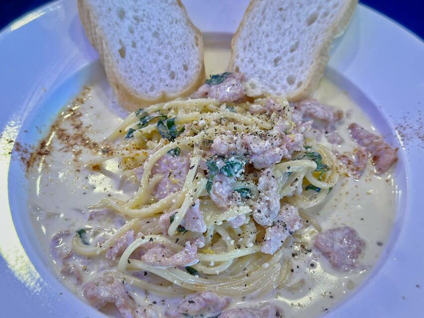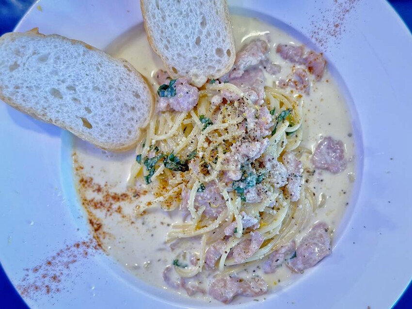 ●培根奶油義大利麵佐法國麵包