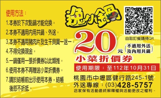 結帳時每一鍋都還會贈送一張20元小菜折價券,可於下次使用。