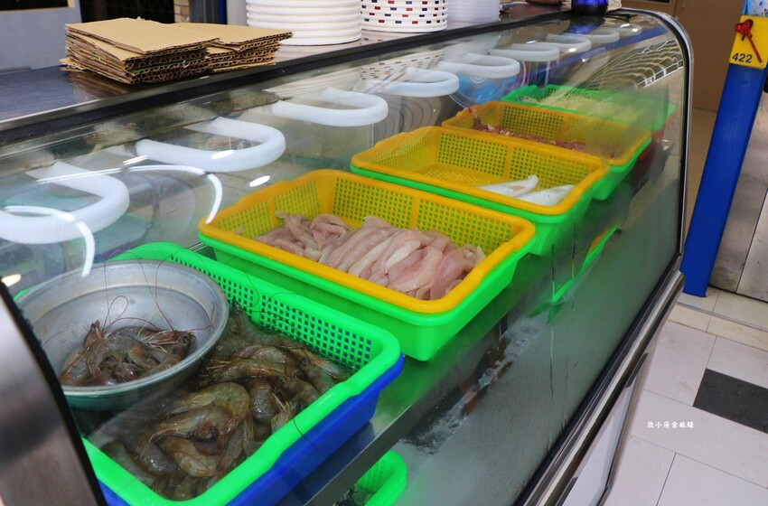 冰櫃裡有鮮蝦、虱目魚肉、虱目魚肚、蛤蜊、蚵仔、肉絲以及加在高湯裡會更鮮甜的筍絲