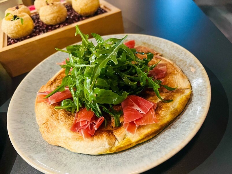 上面放了很多芝麻葉,火腿的鹹香加上芝麻葉的清爽,搭配著烤餅吃,烤餅外酥內軟,是一道吃起來無負擔的料理,不論配酒、配話都很合適!