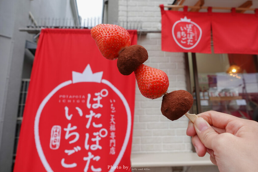 藥妝店旁邊的草莓大福專賣店,是一個小攤販,只限外帶。可愛的外型吸引不少人注意,販賣草莓大福、草莓麻糬糖葫蘆、草莓棉花糖串等,一串400日元。雖然草莓大顆,不過吃起來好像沒有很甜,不知道是不是過了季節的關係。
