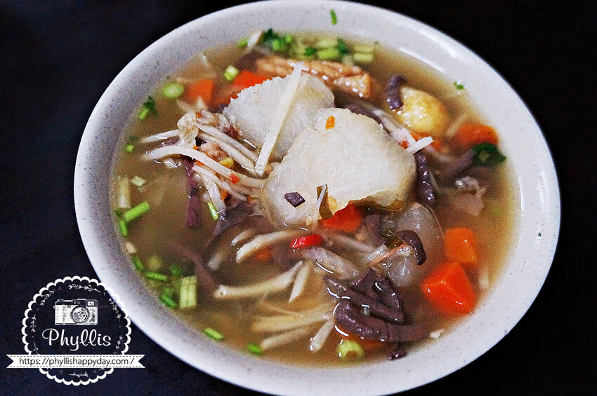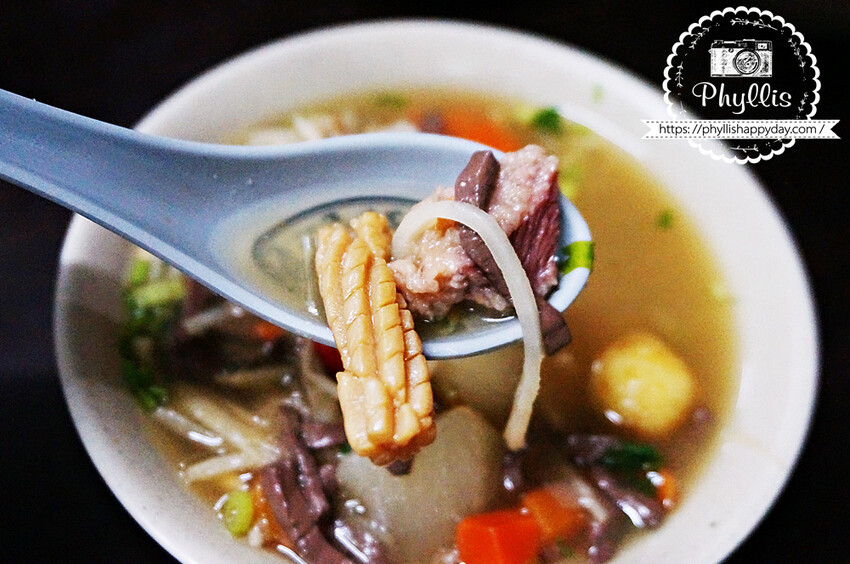 大鍋湯裡面有魷魚花、排骨肉、鴨血、炸過的鳥蛋