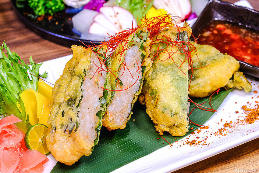 緊接而來的這道「紫蘇蝦餅」我個人很推薦,將厚實的蝦漿用紫蘇葉包覆,再裹上一層麵衣去炸熟,一旁有附上泰式甜辣醬可以沾著吃。