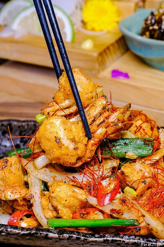 「酥炸一口小螃蟹」同樣也是很受歡迎的無菜單料理,小螃蟹表面沾裹薄粉麵衣炸過後,再搭配蒜片、蔥段、辣椒一起爆炒過。