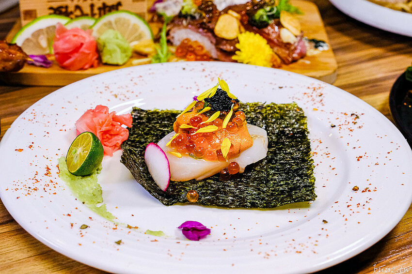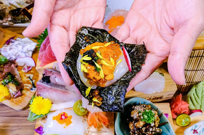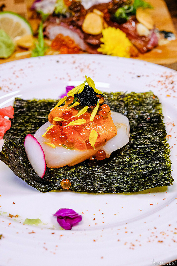 吃得時候就是用海苔包裹著一起吃下,滑嫩鮮甜生食級干貝搭配海中牛奶海膽的甜味,在嘴內咀嚼時雙重甜味交疊的滋味真的超讚~