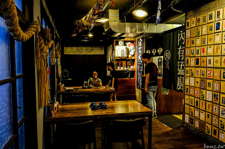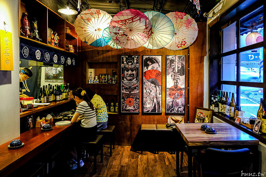 一踏入就能感受到那濃濃的日式居酒屋的氛圍,店內用到了很多日式物品點綴,像是旗幟、油傘、酒瓶、帆布等,將店內氣氛營造的很到位。
