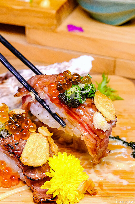 松露雪花牛,是將雪花牛肉炙燒到半熟程度,並在上頭搭配松露醬、蒜片及鮭魚卵,軟嫩的牛肉在松露醬、蒜片襯托下更為鮮甜,氣味交疊相當豐富有層次。