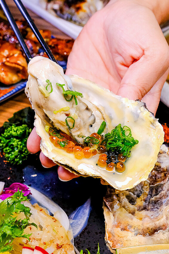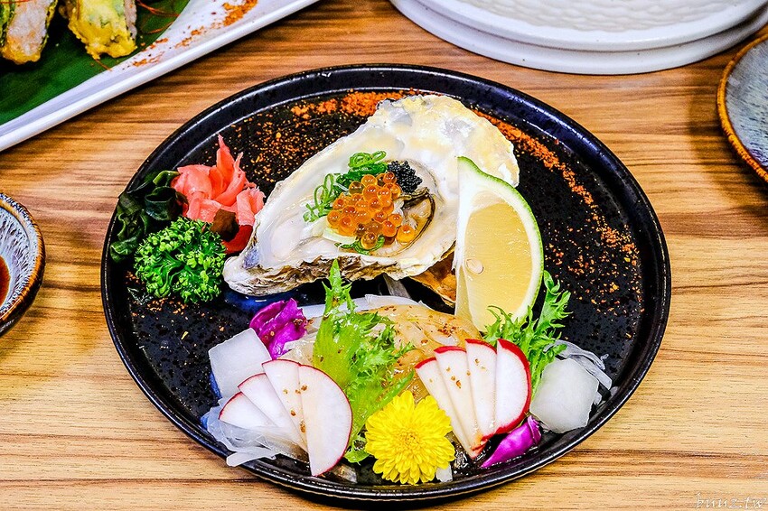 一口吃下可以感受到生蠔的滑嫩鮮甜,配上啵啵啵的鮭魚卵增添鹹甘滋味,甚至還可以擠一些檸檬汁襯托生蠔的鮮味。