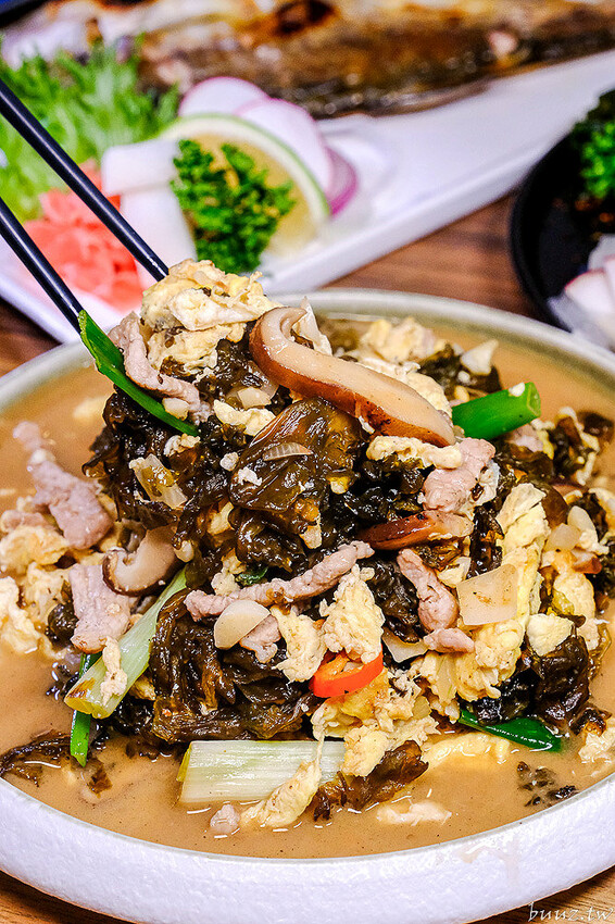 有叫炒飯的話,這道「香爆肉絲雨來菇」料理很適合搭配一起點,雨來菇搭配肉絲、海茸、蔥段下去爆炒。