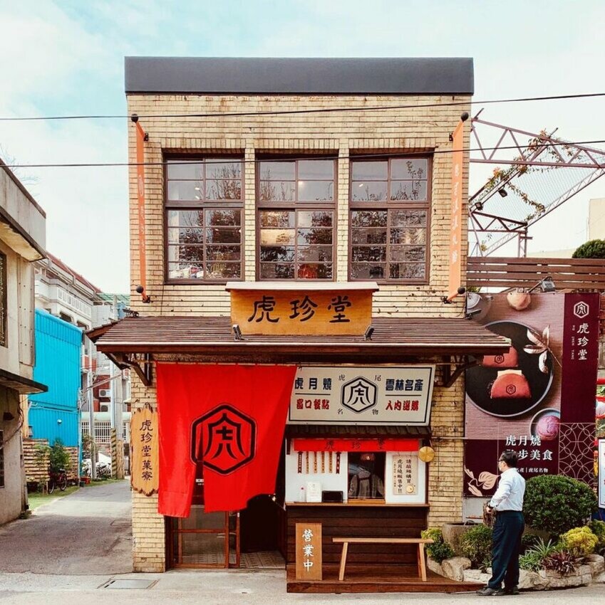 『請敲鑼購買!虎月燒販售中!』門前的告示牌鏗鏘有力,這是一幢古色古香的日式建築,周圍復刻了鳥居與繽紛的燈籠巷。左手邊的大紅的門簾布上寫著瀟灑的「虎」字,這間虎珍堂是雲林人都知道的伴手禮店。由七十年的老屋改建而成,二樓的內用座位則鋪滿榻榻米坐墊,配上復古櫥櫃與擺設,完整保留了歷史原貌。招牌虎月燒是用似銅鑼燒的餅皮夾著各種餡料的甜點,有原味、日式抹茶與紫薯卡士達三種口味,口感扎實、甜而不膩,快一面品嚐美味小點,一面搭乘上這班回到日治時期的時光列車吧!