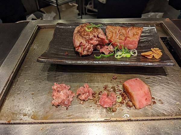 師傅將牛排及漢堡排稍微煎過上下兩面後就會放到盤子上,客人可以將夾成一口一口的大小放到鐵板上加熱,熟度可以自己控制,也不怕吃到最後會涼掉,不過要小心很容易被油噴到。