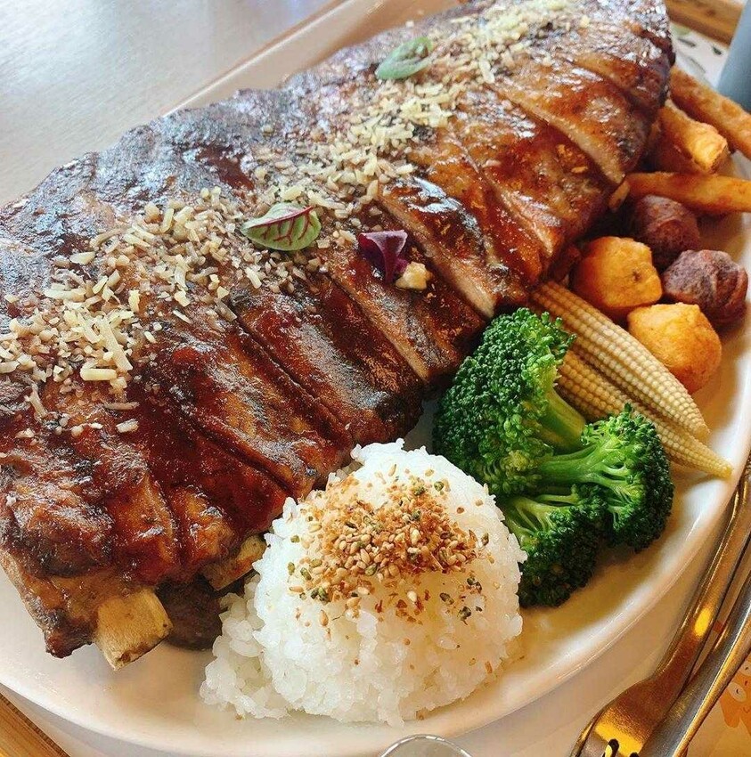 小編推薦愛吃肉的捧友,一定要品嘗人氣餐點煙燻炙烤大豬肋排佐自製檸檬薄荷凍,超大份量可供兩人分享,鮮嫩多汁的豬肋排,搭配檸檬薄荷凍清新爽口能去油解膩。