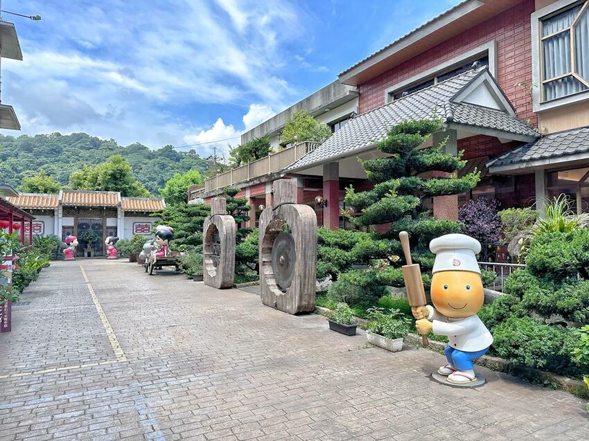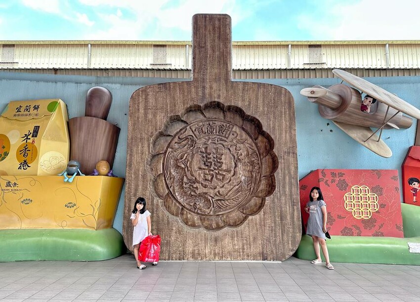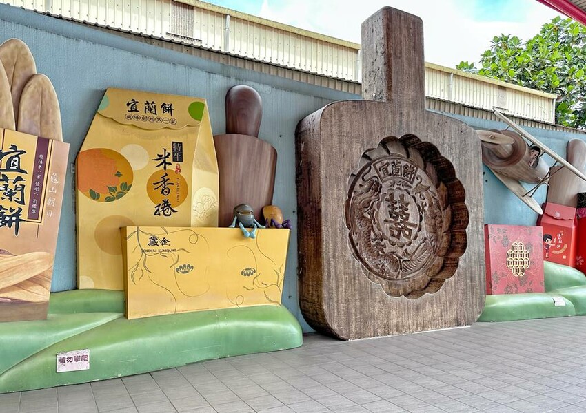 來到宜蘭餅發明館的戶外廣場可以直接看到糕點列車、巨無霸糕餅模具,以及巨大的宜蘭餅、米香捲等可以拍照打卡!