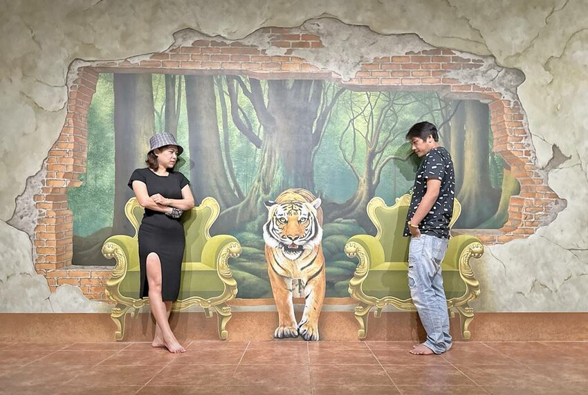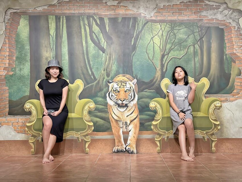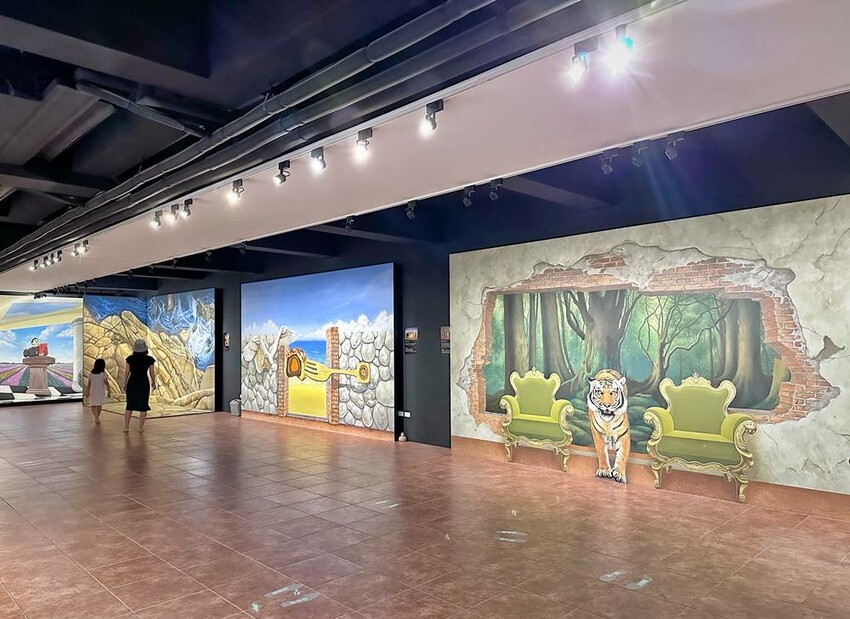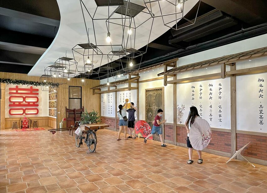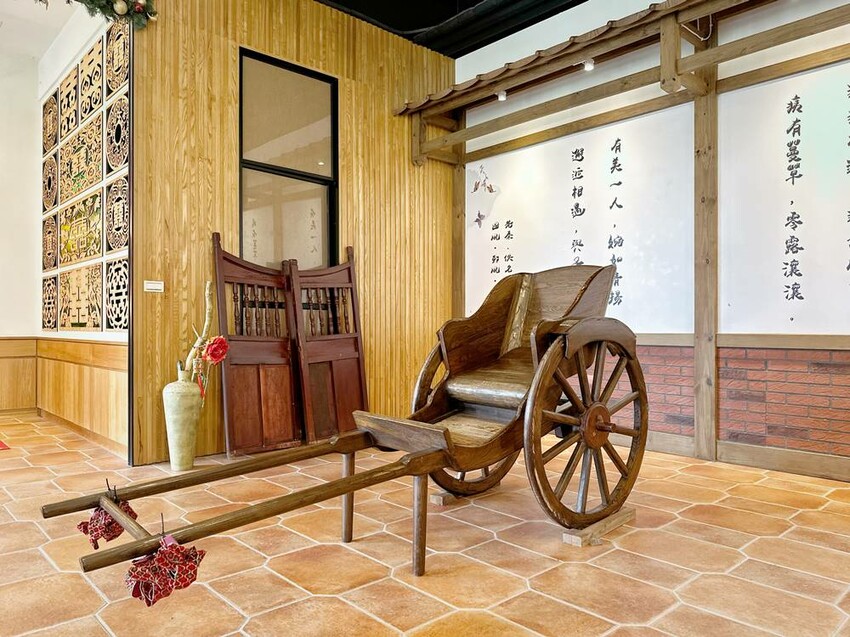 而只要有消費,憑發票或是收據都可以免費去參觀3D立體彩繪館。3D立體彩繪館的一樓空間挺寬敞,且帶有濃濃復古味,擺設著傳統轎子、腳踏車等,整個擺設超古色古香,同時也提供不少扇子、紙傘等可拍照打卡!