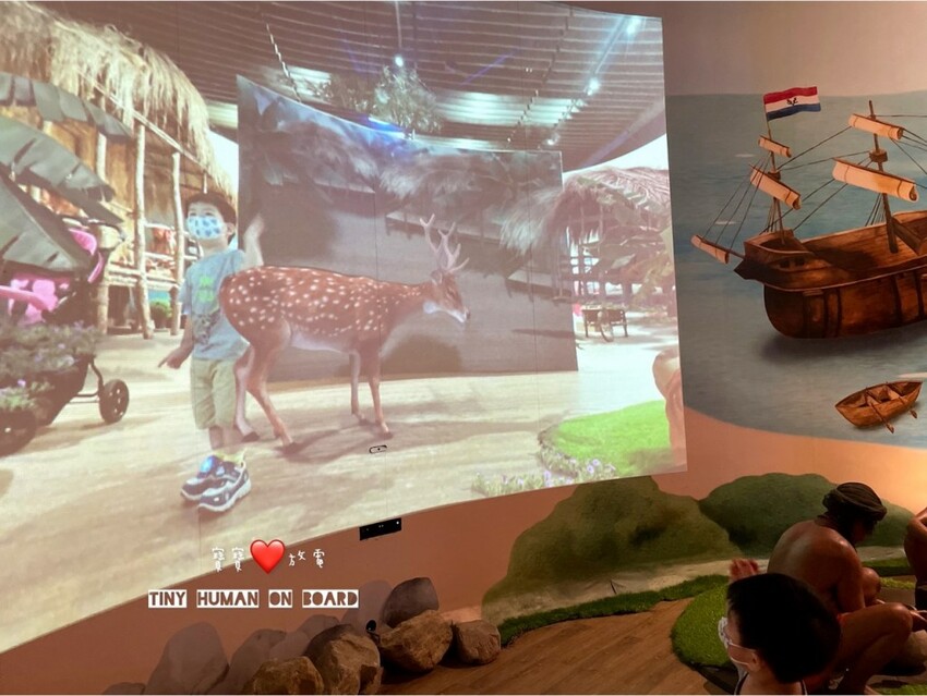 🔽 這個互動螢幕裝置也好好玩,可以想見當時八里的生活,路上還會出現梅花鹿、雞、牛等等動物(小邦試著拍拍梅花鹿的屁屁)