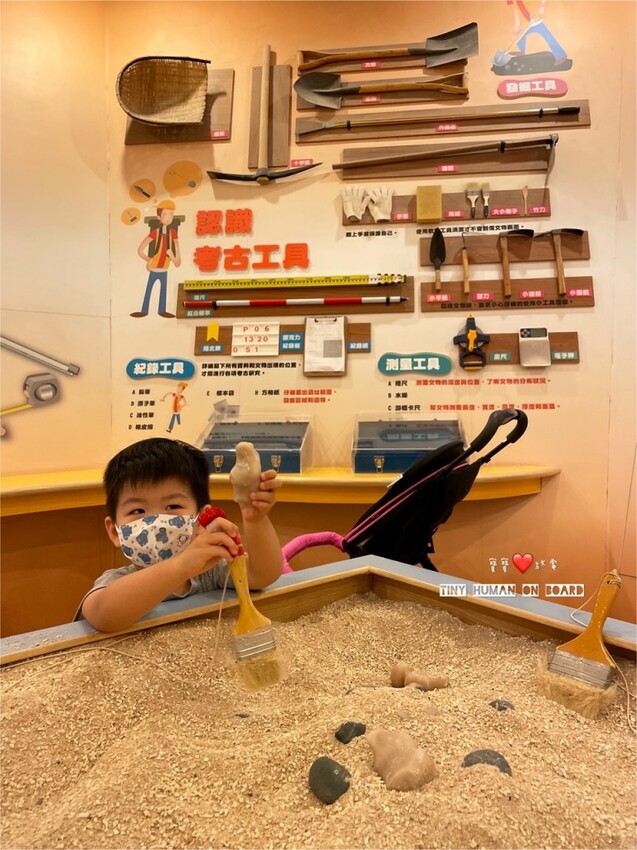 🔽 來到全台第一個考古博物館,當然也要Hands On實際體驗考古的樂趣啊!位於二樓的考古體驗室,就可以讓小朋友們體驗從挖掘、秤重、到拼湊等樂趣。這裡挖不夠還可以結合考古公園的沙坑。