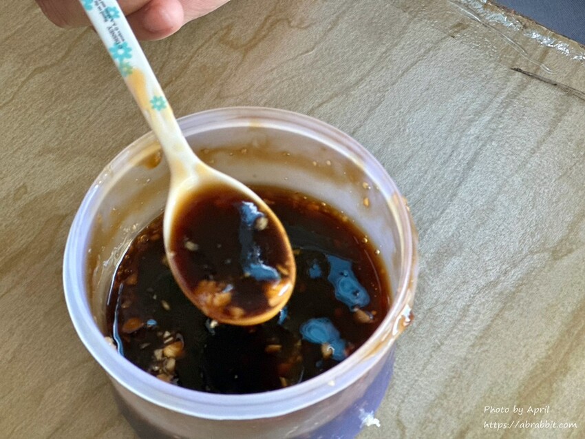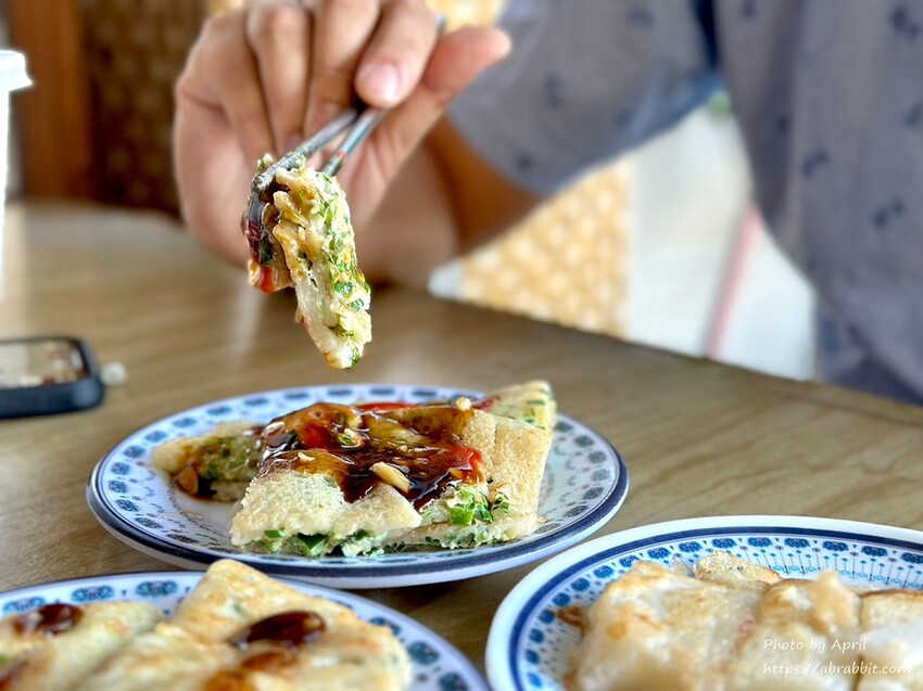 粉漿蛋餅還帶著氣孔,也因為有韭菜的關係,吃起來帶點微甜,還蠻特別的滋味;淋上蒜蓉醬油膏和辣椒醬也很不賴。